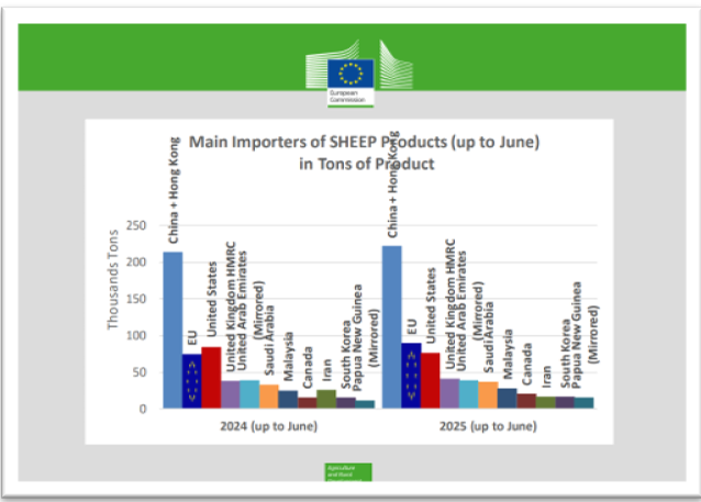 Az EU juh- és a kecskehús, valamint élő állat kivitele 2025 első félévében 54 616 tonna vt. (vt. = vágott testtömeg) volt, mely összesen 481 millió Euro értéket képviselt. A kivitel mennyisége 3 514 tonna vt. értékkel (6,8%), értéke pedig 80 millió Euro-val (19,95%) emelkedett az előző év azonos időszakához viszonyítva.